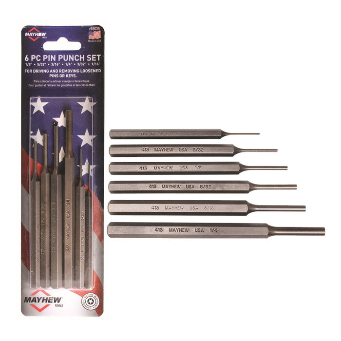 Mayhew Steel Products, Inc. (Mayhew Tools) is introducing a new 6-piece Pin Punch Set. This new, made in the USA, set features 6 pin punches in a popular mix of sizes.